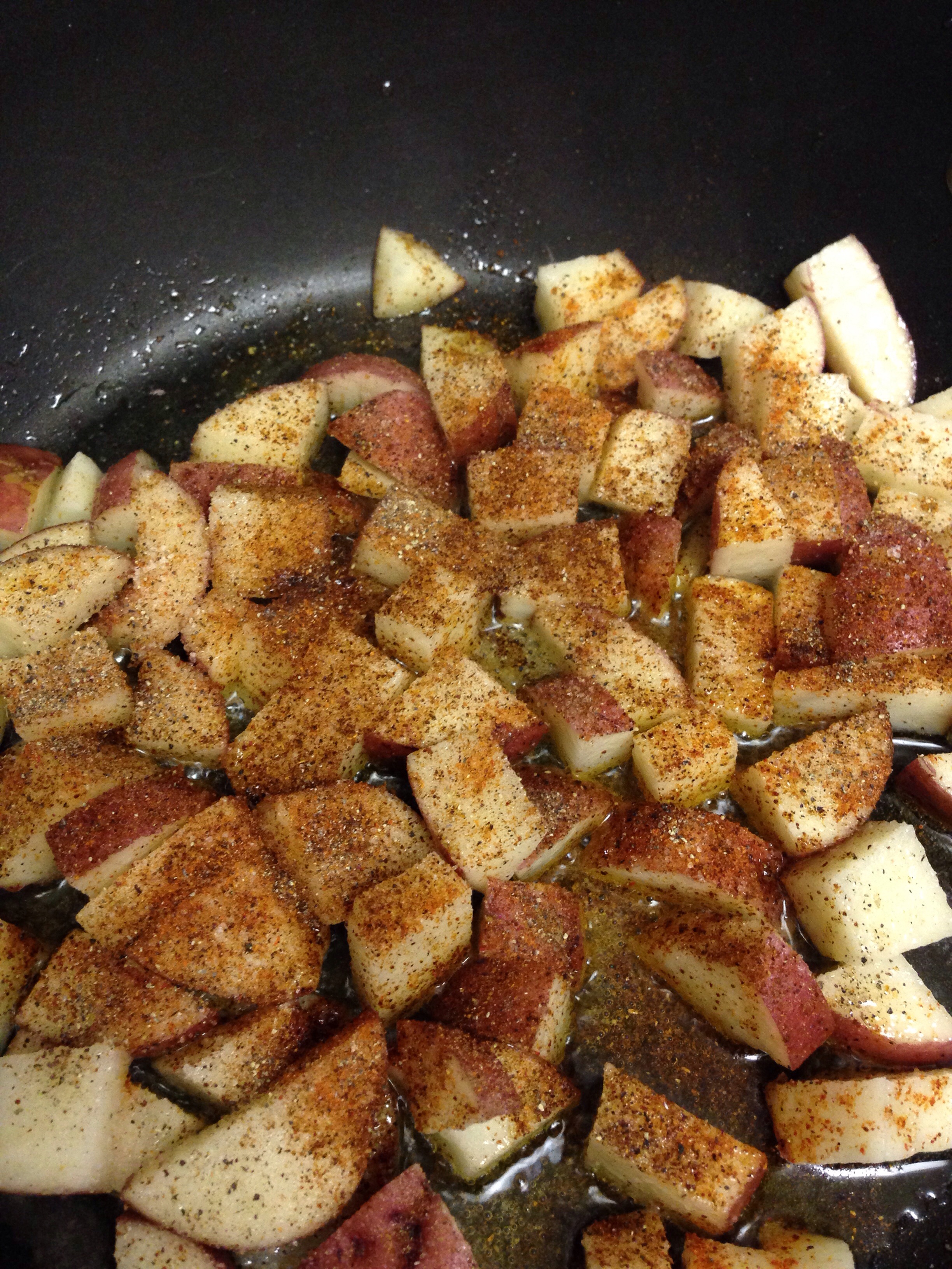 Warm 1 Tbsp of olive oil in a medium skillet and add potatoes
