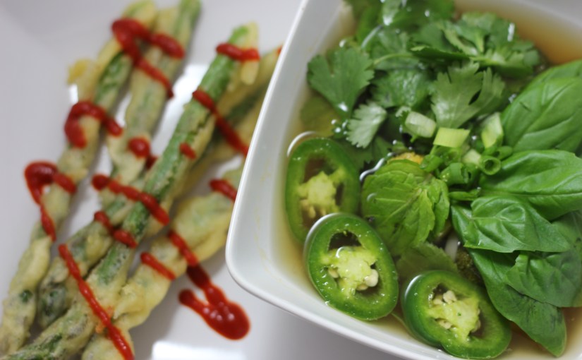 Spoon into bowl and top with basil, mint, jalapeno and cilantro