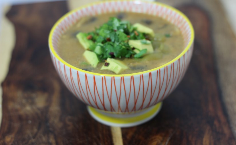 Top soup with green chilies, avocado, green onion, cilantro or mushroom