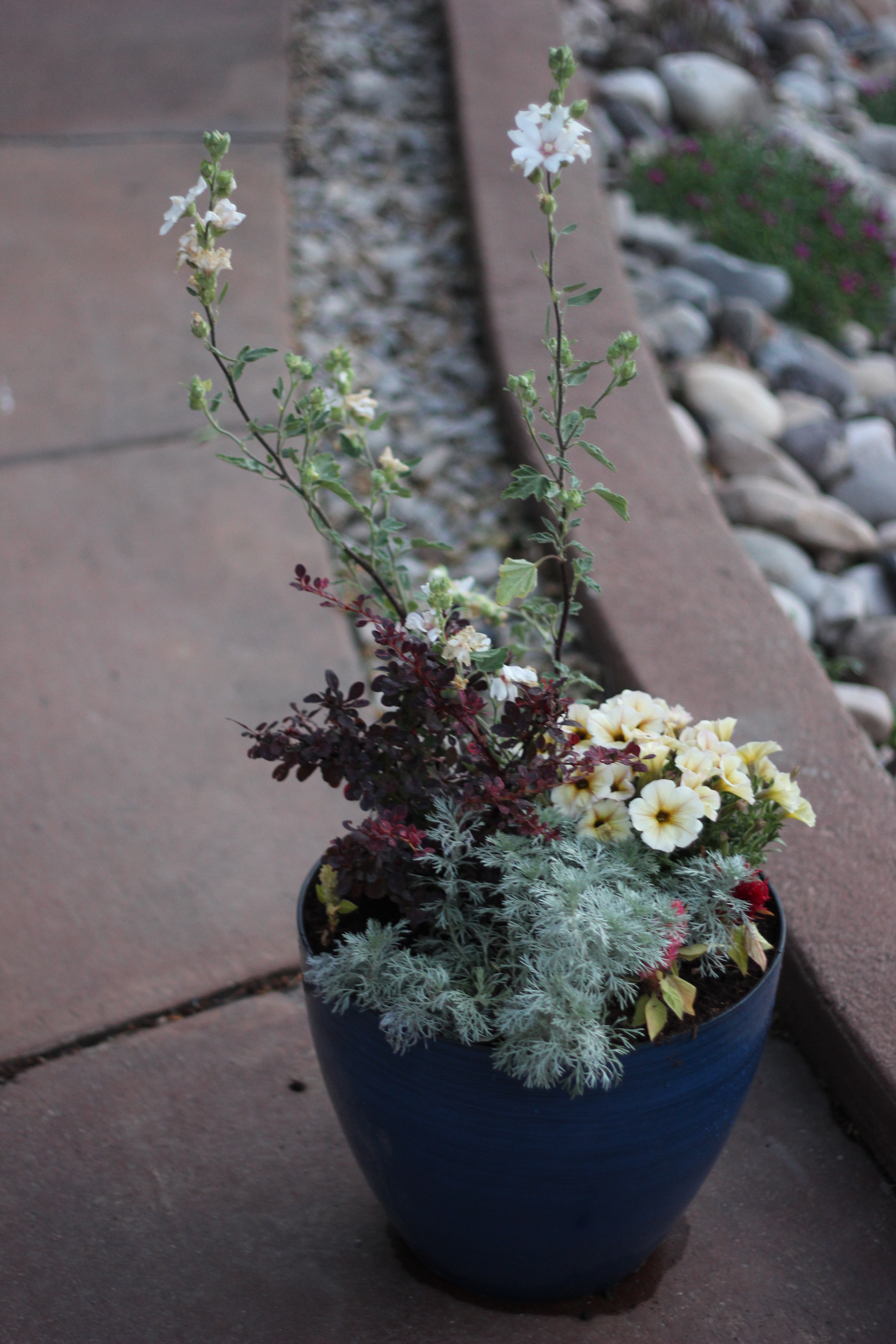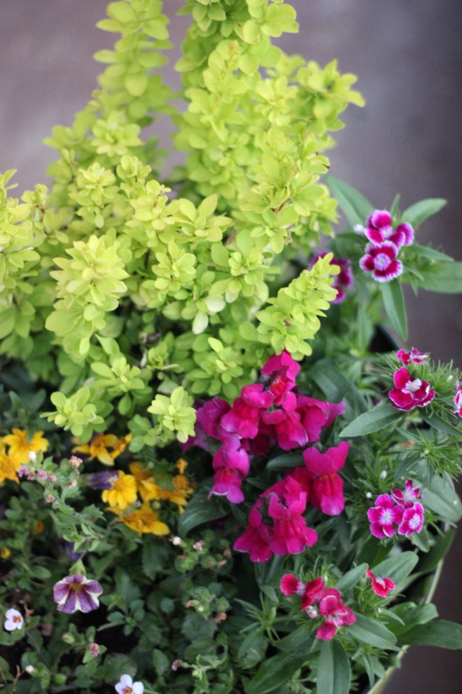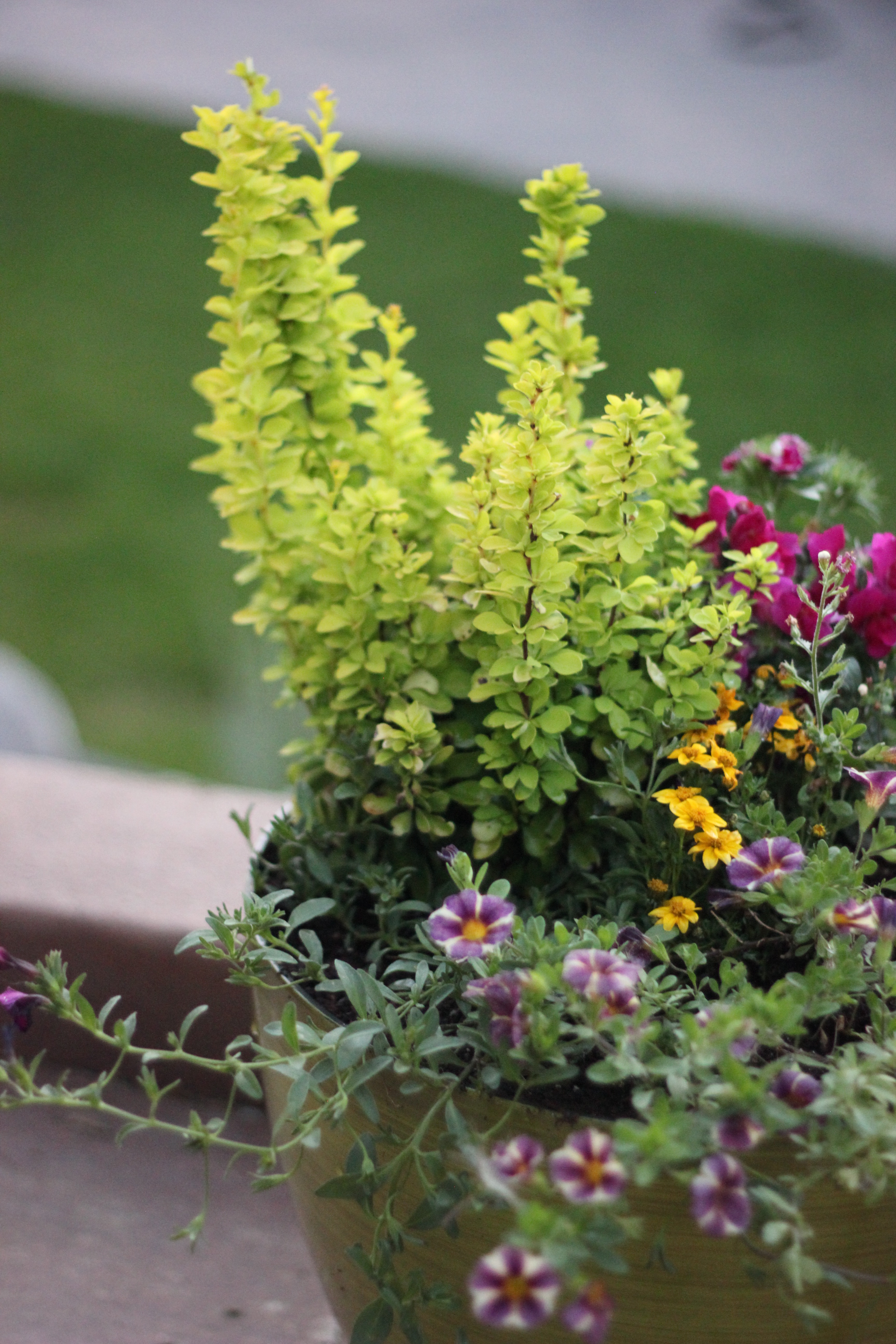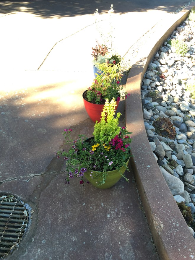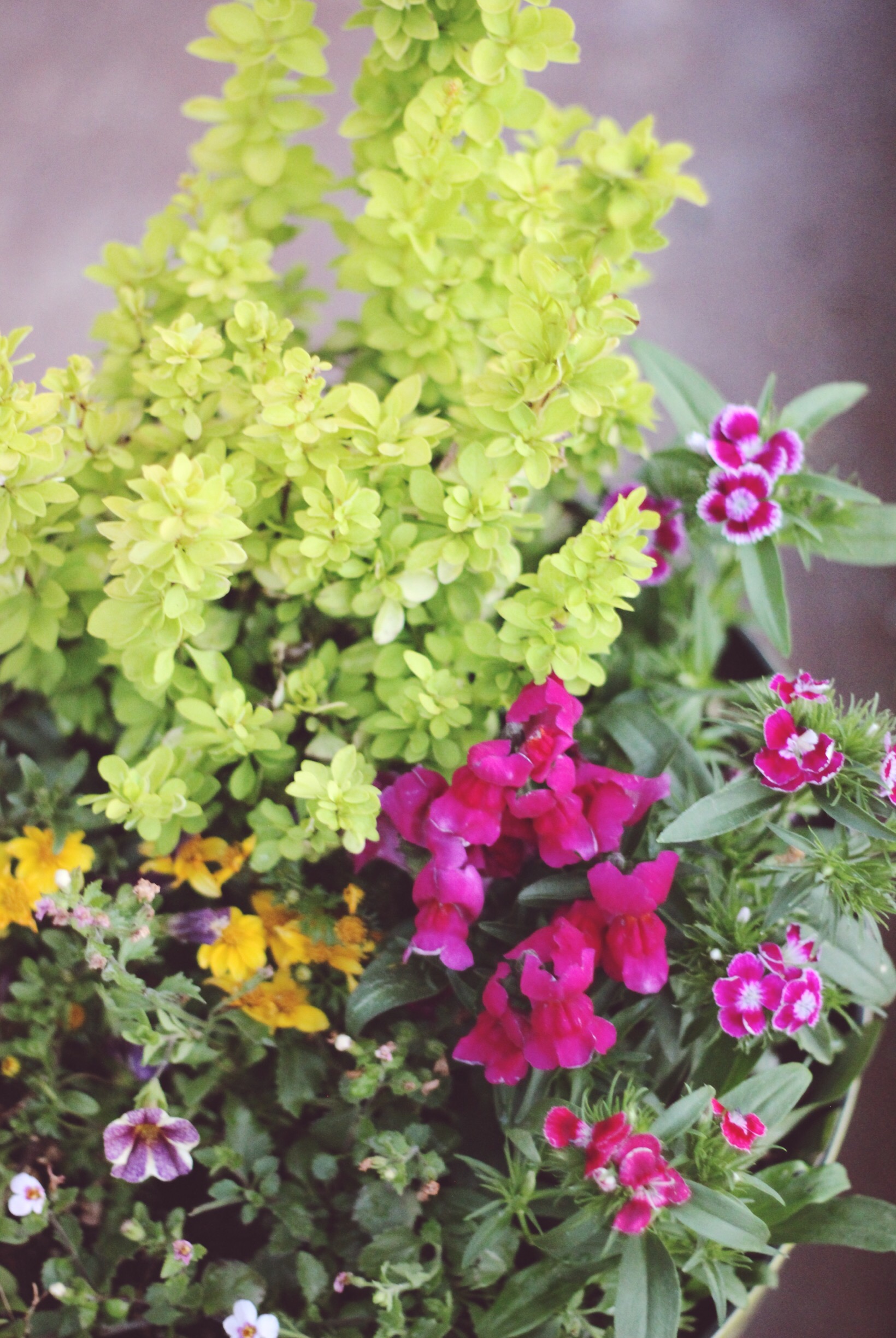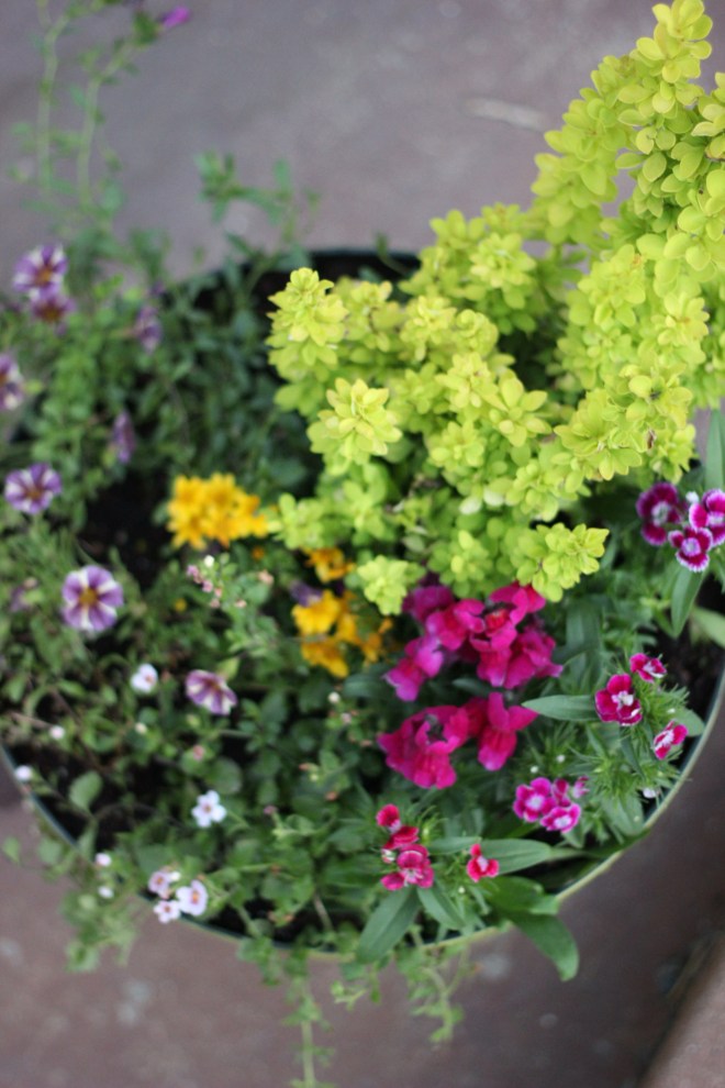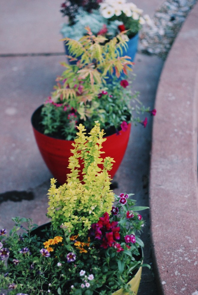 I found the cutest planters at Big Lots for $10 over the weekend! I love the bright colors, I got one of each. I did drill a few holes in the bottom to help with drainage as well as putting a few rocks in the bottom. I filled the planters about half way up with my own soil and then used a potting mix for the rest. I went to Glover nursery in West Jordan to get all my plants. I love mixing so the bright colors. I did a mix of bright annuals along with some perennials I will transplant into my yard in fall. Here are a few photos of the finished products.