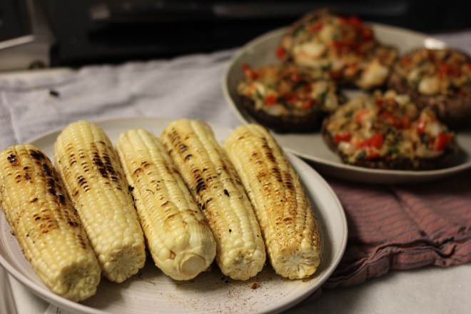 I also brushed a few ears of corn with olive oil, sprinkled salt and pepper along with some chili pepper on them and put them on the grill also.  They turned out great!