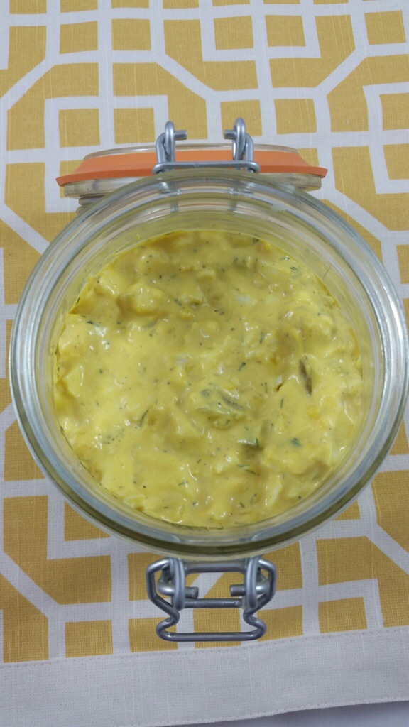 In a bowl combine eggs, avocados, salt, pepper and pickles