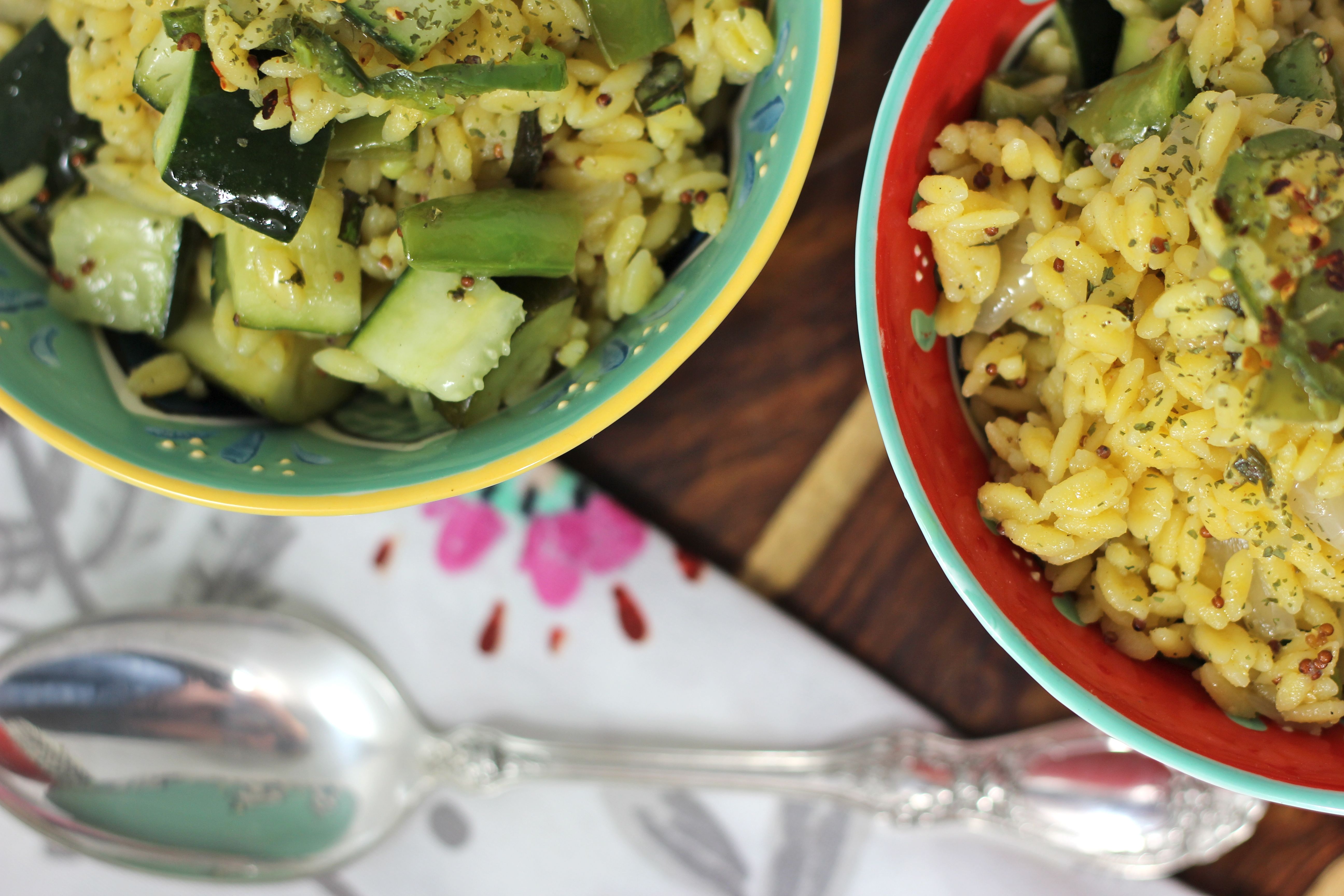 Orzo is a great option for people who are gluten intolerant. This salad is quick, easy and much healthier than traditional pasta salad. Add any greens or fresh herbs you have on hand, this salad is very versatile.