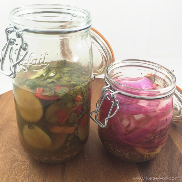 In a large jar place the red jalapeño’s, habanero and cucumbers