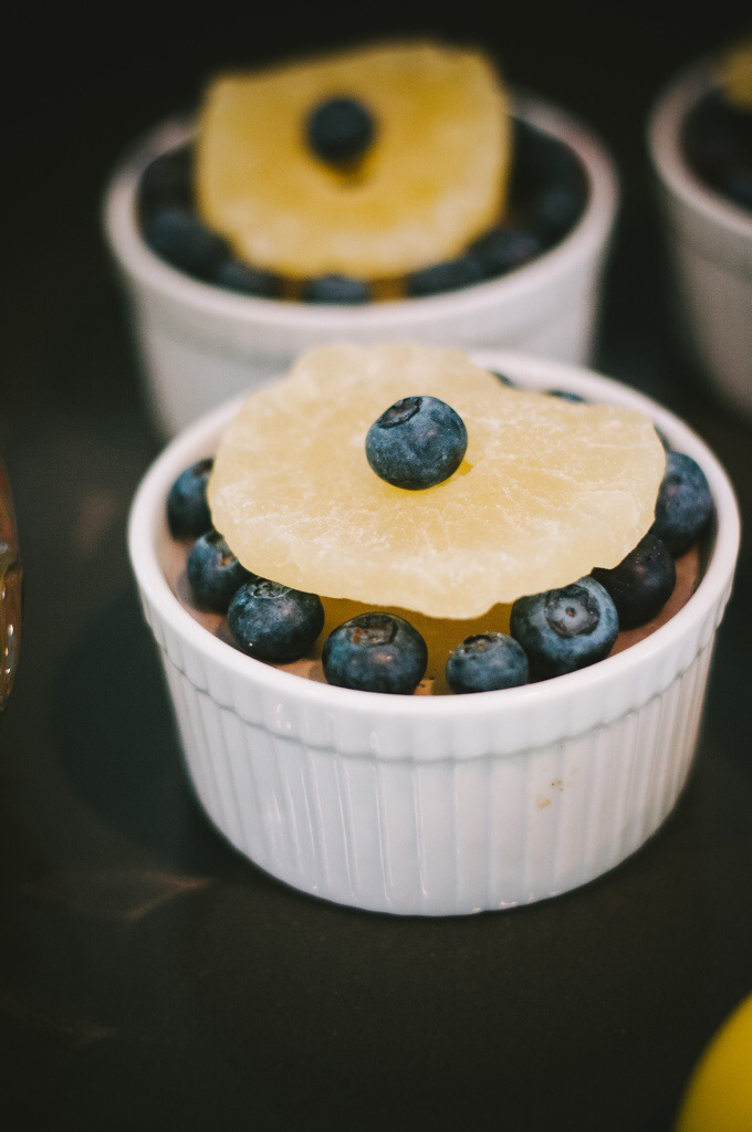 Garnish with more fresh blueberries and one dried piece of pineapple for each tart