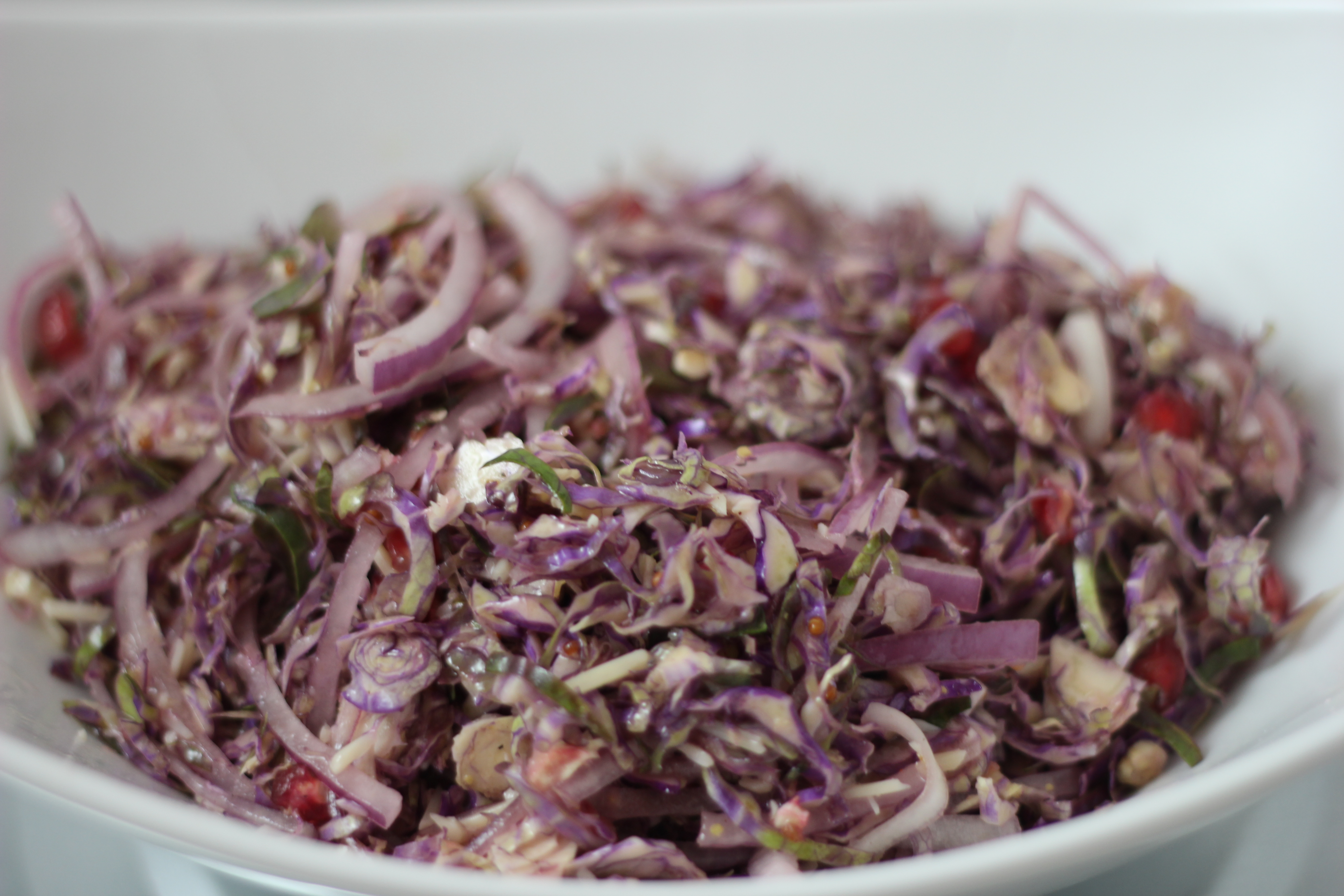 Combine brussel sprouts, onion, pomegranate and cheese in a large bowl
